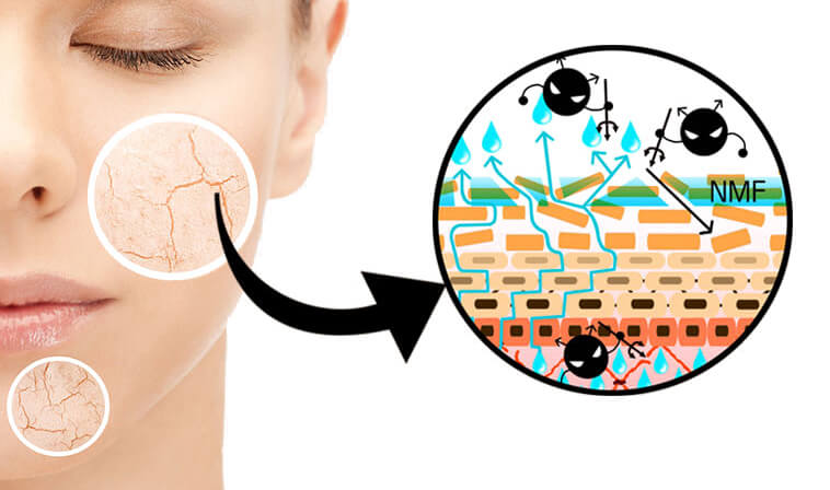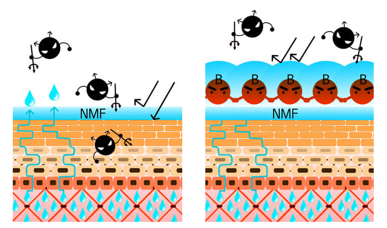The uppermost layer, stratum corneum, has Natural Moisturizing Factor (NMF) which is maintaining proper moisture level. NMF-like substances produced during the fermentation process of bifidobacteria strengthen the skin barrier. Maintaining an appropriate amount of NMF in skin is important for skin barrier to keep skin health. Skin barrier protects skin from external harmful substances and also prevents moisture loss.