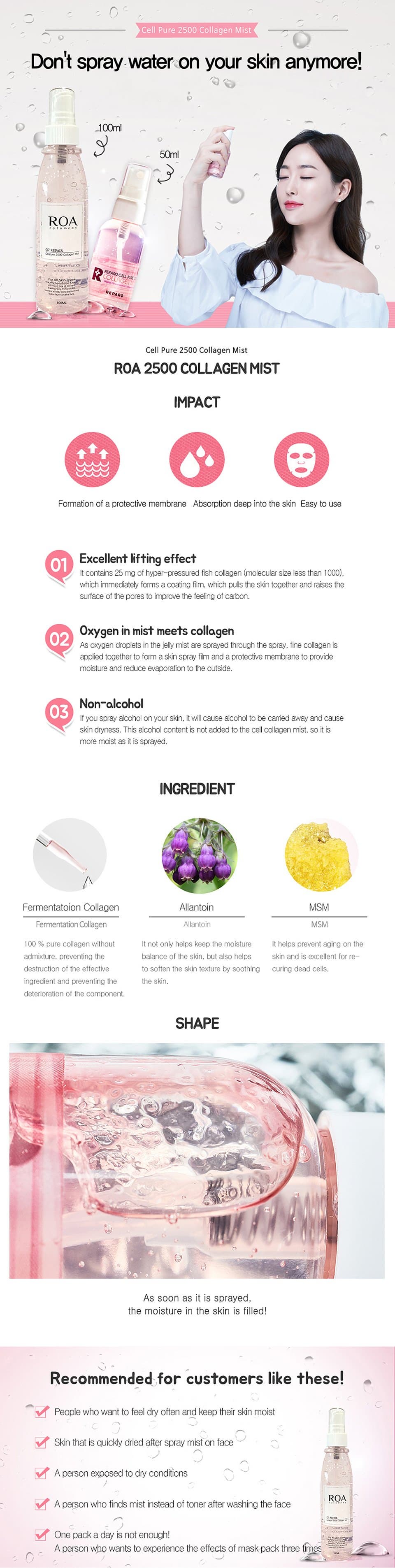 It contains 25mg of hyper-pressured fish collagen. Which immediately forms a coating film, which pulls the skin together and raises the surface of the pores to improve the feeling of carbon. As oxygen droplets in the jelly mist are sprayed through the spray, fine collagen is applied together to form a skin spray film and a protective membrane to provide moisture and reduce evaporation to the outside.