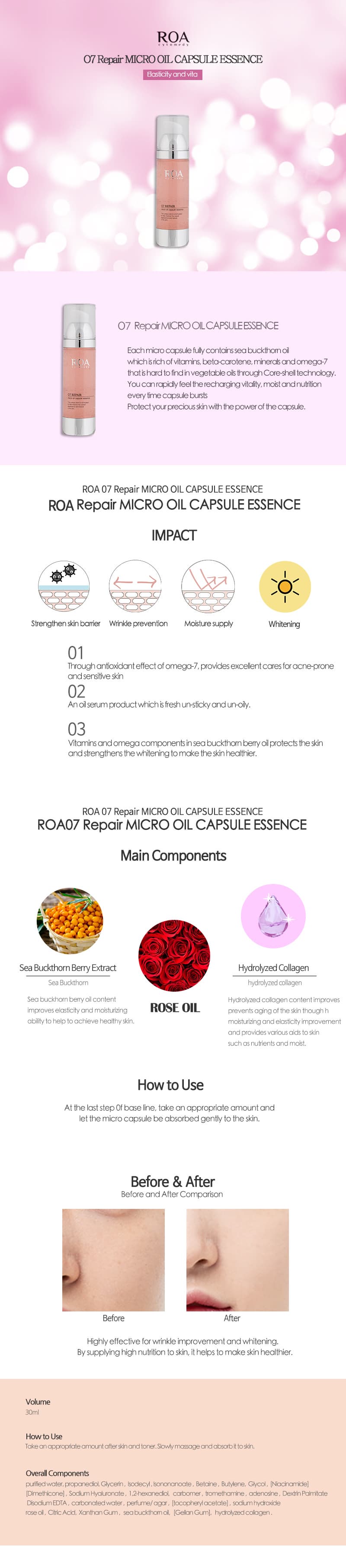 Serum that offers double the potency by coating your skin in a 100% oil base, not just extracts.Oil that covers the lines of wrinkles to feel both oil and moisture!■ Product features- Seabuckthorn oil contains omega 7 (Palmitoleic acid) ingredients that are not contained in other vegetable oils, thus providing cell regeneration and collagen synthesis.- Airless containers will be used to provide the skin with effective ingredients in the capsule.- High moisturizing oil essence, which is a weakness of oil essence, is not slippery and sticky, so it only feels fresh and moist.