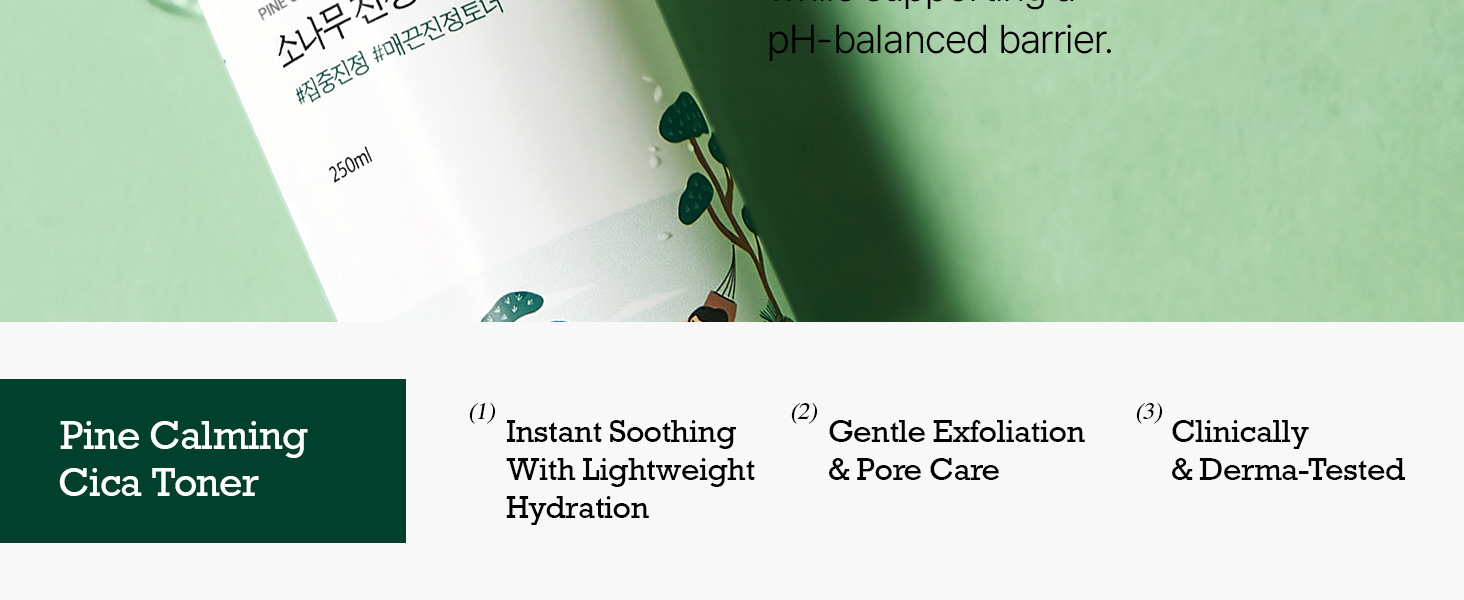 ROUND LAB Pine Calming Cica Toner (250 ml) is a gentle, hydrating toner crafted to care for irritated or sensitive skin. Enriched with Pine Cica Activer™—a proprietary blend of pine leaf extract, plant-derived glycoprotein, and five Centella Asiatica-derived cica components—the formula helps calm redness, reinforce the skin barrier, and offer soothing nourishment.