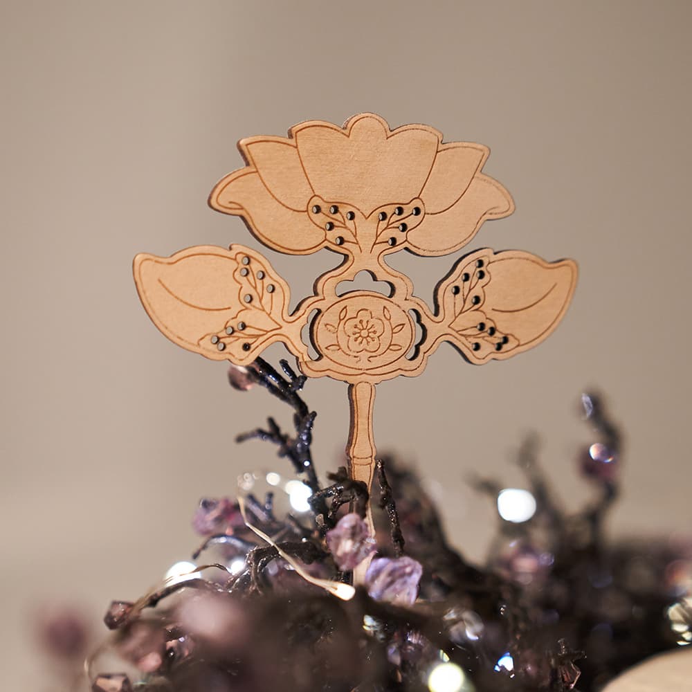 Starting with the bamboo, a symbol of loyalty, the flower of the Korean Empire, plum blossom Oyatkot (Prunus triflora Roxburgh,李花), is placed in the center.