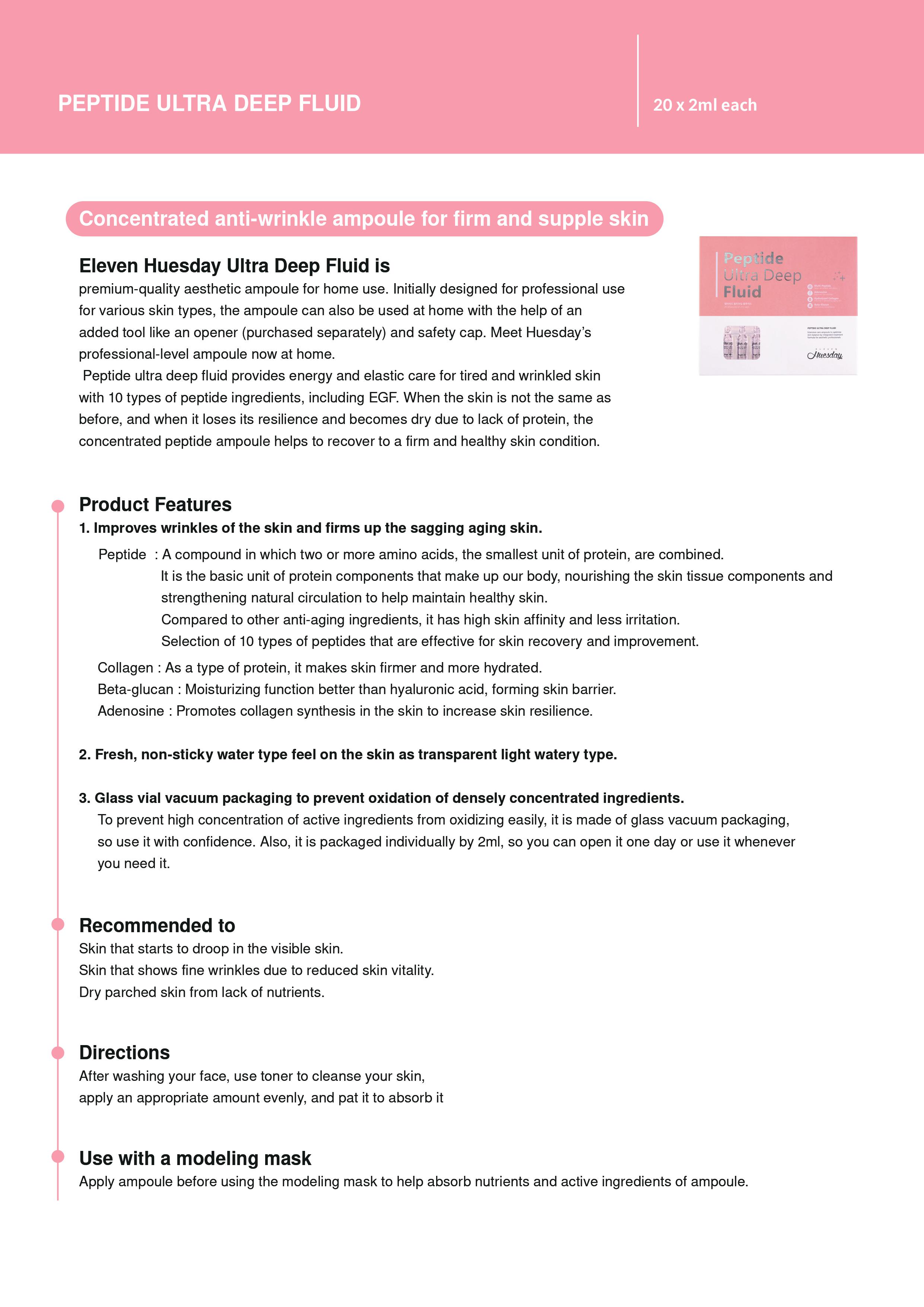 Peptide Ultra Deep Fluid provides energy and elastic care for tired and wrinkled skin with 10 types of peptide ingredients, including EGF. When the skin is not the same as before, and when it loses its resilience and becomes dry due to lack of protein, the concentrated peptide ampoule helps to recover to a firm and healthy skin condition.