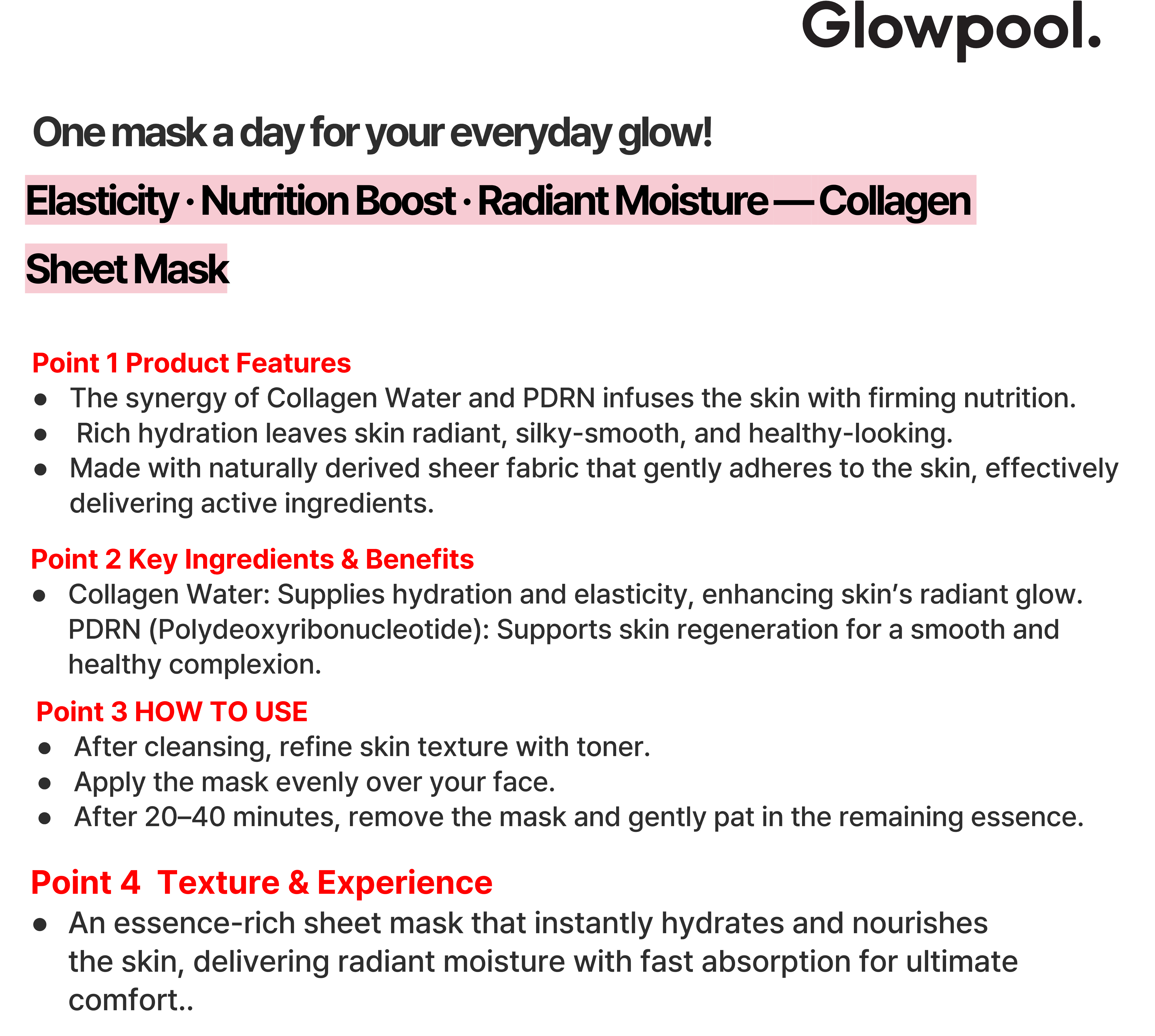 • Provides elasticity and nutrition to the skin through the synergy of collagen water and PDRN.
