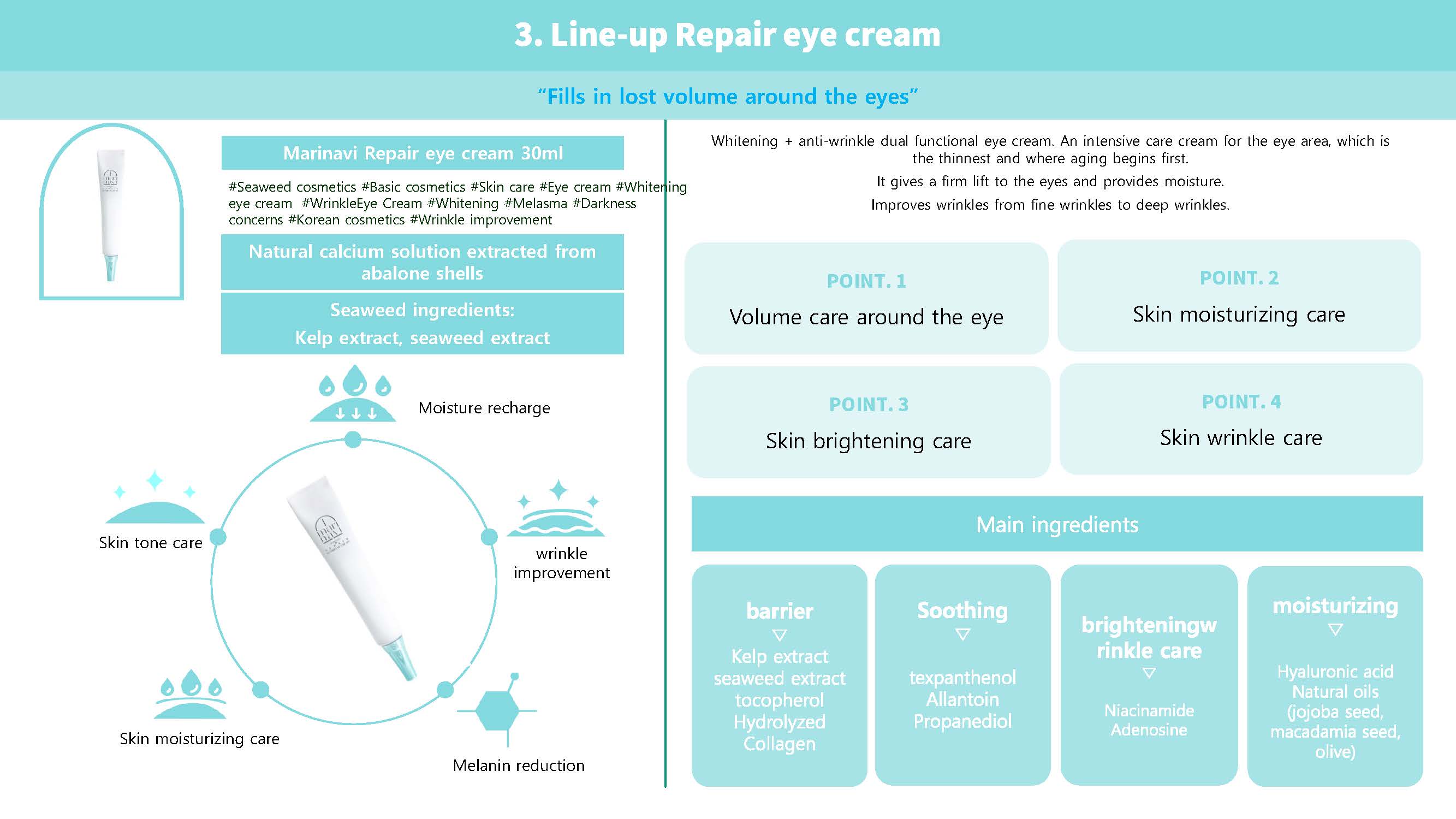 #Seaweed cosmetics #Basic cosmetics #Skin care #Eye cream #Whitening eye cream #WrinkleEye Cream #Whitening #Melasma #Darkness concerns #Korean cosmetics #Wrinkle improvement