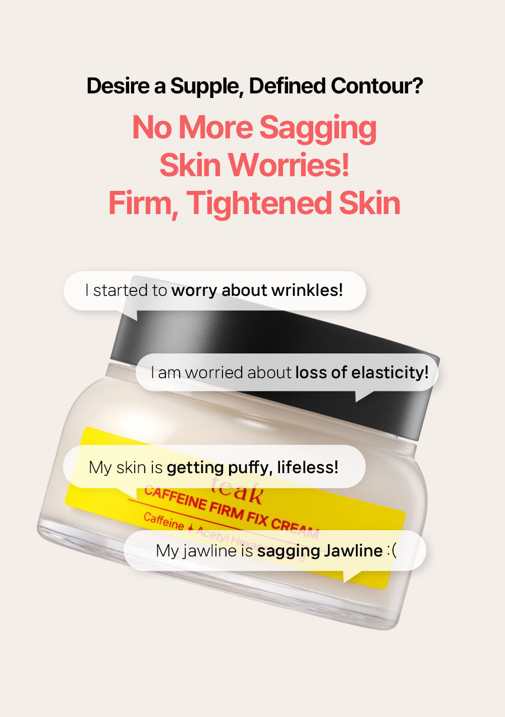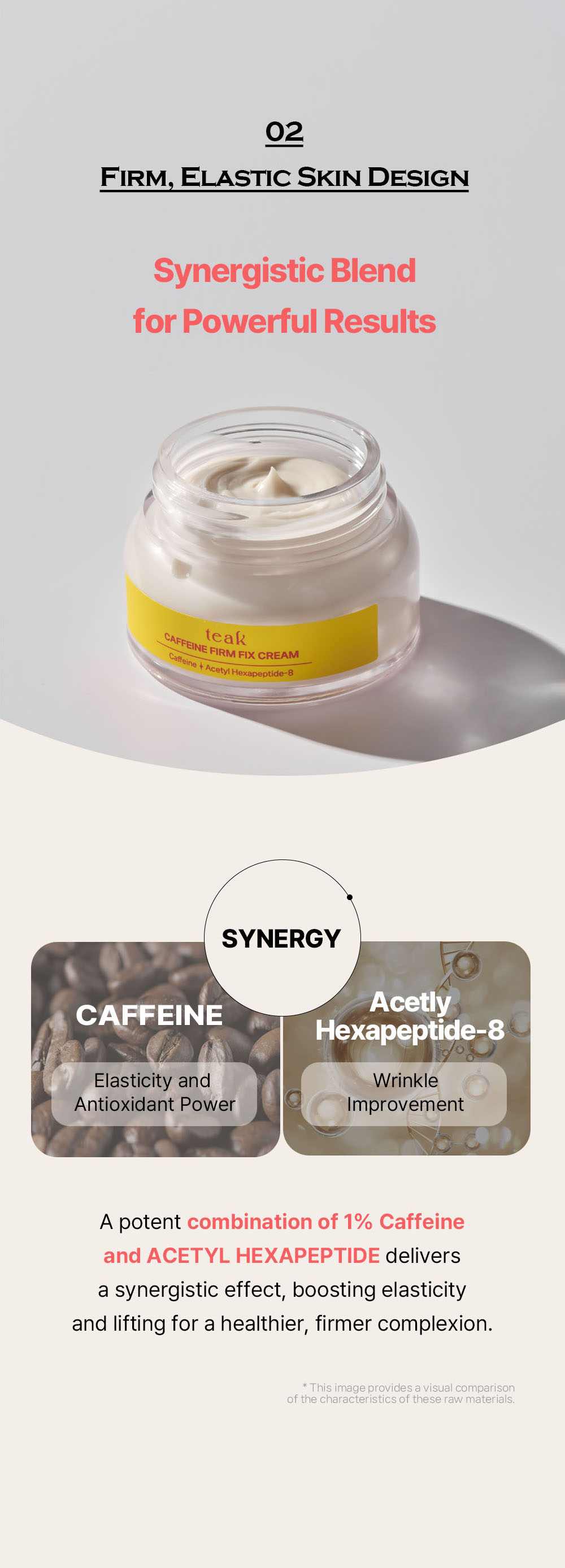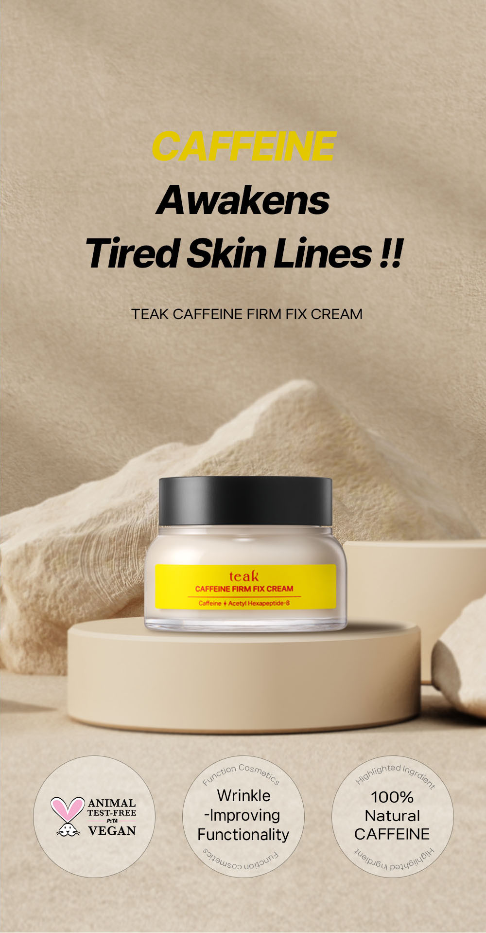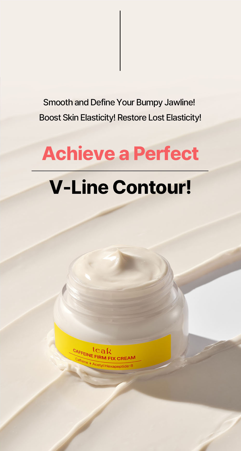 The Teak Caffeine Firm Fix Elasticity Cream is a daily moisturizing cream designed to help care for skin that feels tired or lacks firmness. It contains naturally derived caffeine, acetyl hexapeptide-8, and plant-based oils that help support the skin’s elasticity and provide a more balanced and hydrated appearance. The cream delivers a smooth, buttery texture that spreads gently across the skin and absorbs without heaviness. Its moisture-retaining system helps the skin stay comfortable throughout the day by forming a lightweight protective layer. With regular use, the cream helps the skin feel more supple and refreshed, making it suitable for daily routines that focus on maintaining a well-conditioned skin surface.