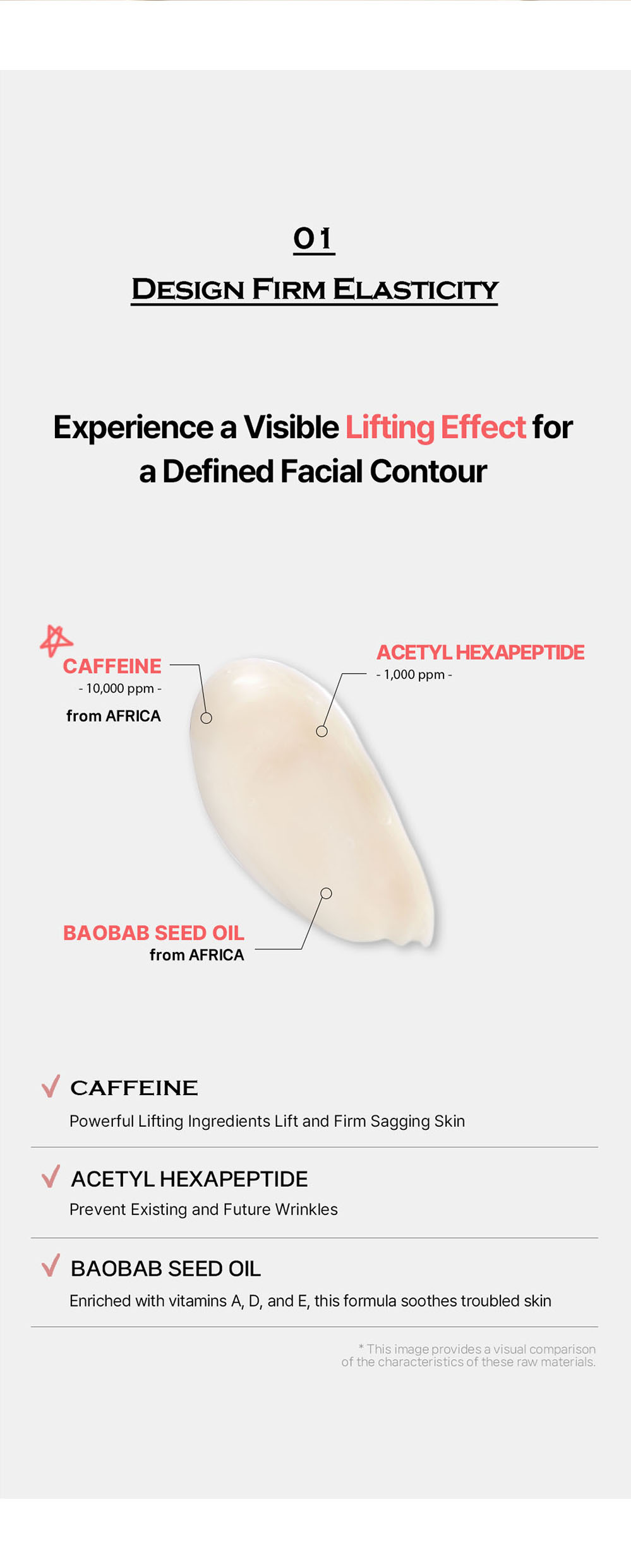 • Formulated with natural caffeine, acetyl hexapeptide-8, and baobab seed oil to boost firmness and re-energize the skin.