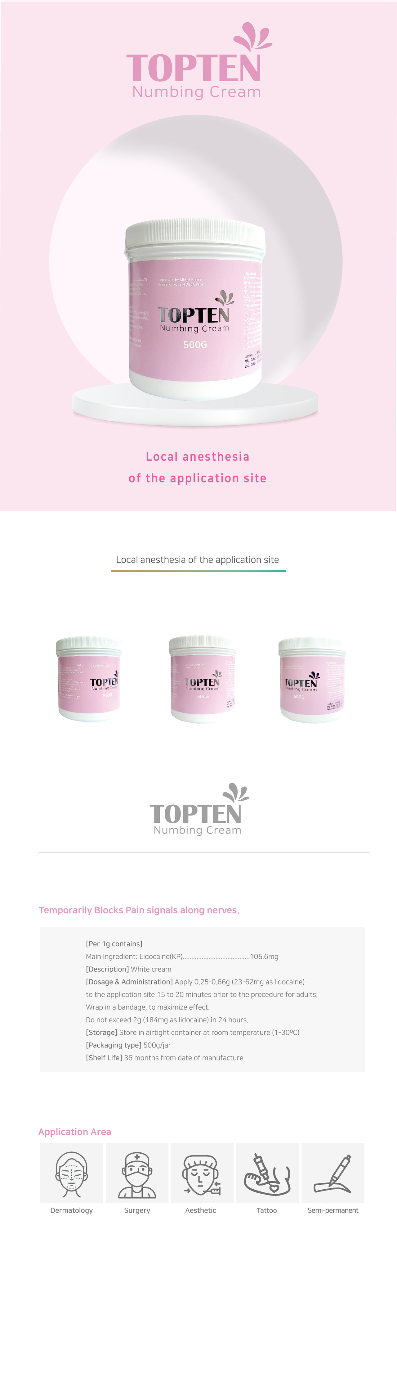 In the clinical setting, this product ensures that patients experience no pain during the procedure. TOPTEN cream is considered one of the best creams in Korea when it comes to topical anesthesia, made in cream form with 10.56% lidocaine.