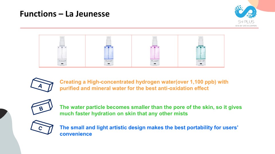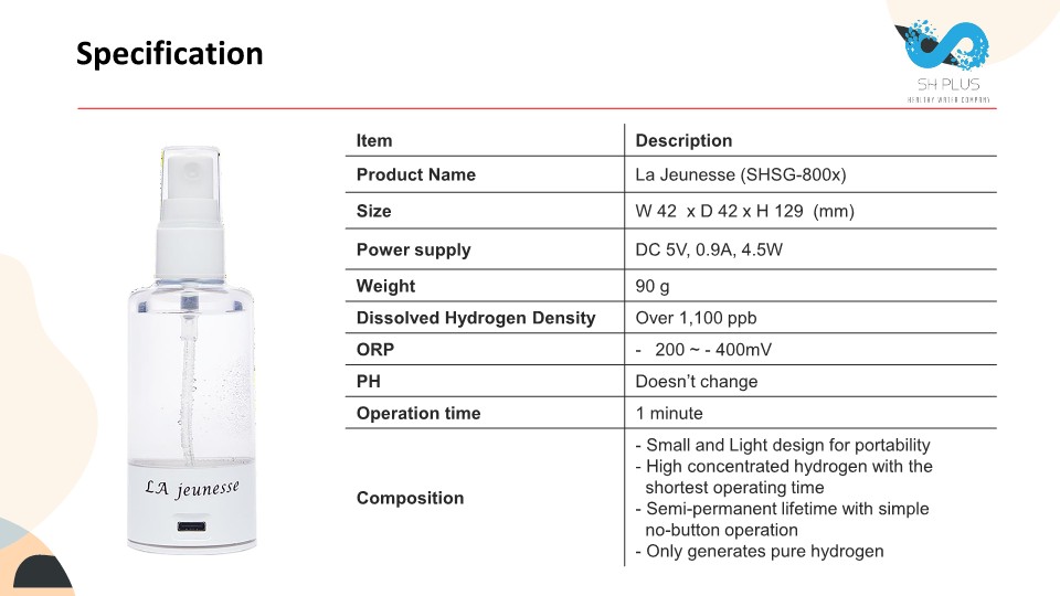La Jeunesse, the portable hydrogen water mist, works like the hydrogen water generator, but it’s designed for skin hydration. Users can use La Jeunesse as a beauty product, and they can fill the water and reuse La Jeunesse, meaning that users do not need to buy mist again.