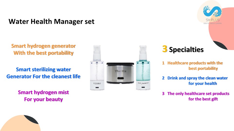 Water health manager is the set of hydrogen products that are good for your health. Hydrogen works as a strong antioxidant that removes free radical that causes a lot of modern diseases. Currently, it is considered that the key of preventing diseases is removing this free radical in medical field. Also, germs and bacteria cause lots of diseases, especially when the environment is not clean. Our product removes pesticide, germs and bacteria in 1 minute, so users can use our products to clean their environment and wash fruits and vegetables without any harmful issues.