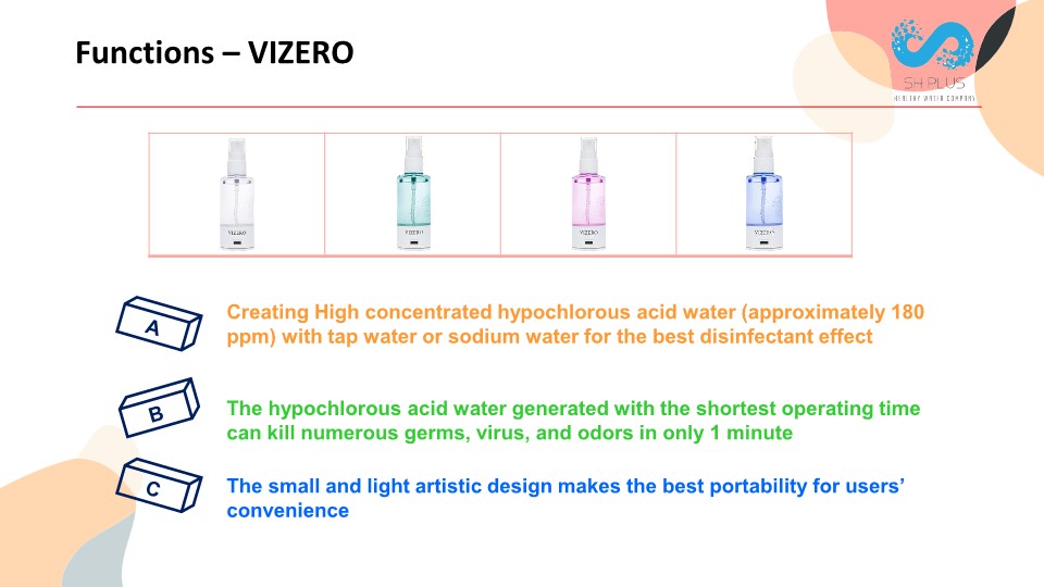 VIZERO, the portable sterilizing water generator, is the smallest and lightest hypochlorous water generator that produces highest, but safe sterilizing water. Users only need to use water and salt(if users want strong sterilization potential) to produce sterilizing water, and it’s perfectly safe to use not like the chemical sterilizing substances.