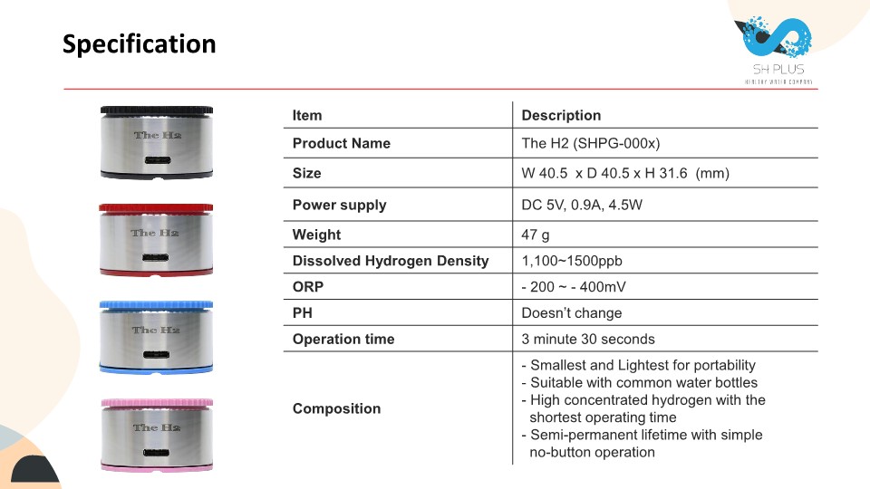 The H2, the portable hydrogen water generator, is the smallest and lightest hydrogen water generator in the market, and the concentration of hydrogen is one of the highest even with the compact size. People can bring The H2 and use whenever and wherever they need hydrogen water.