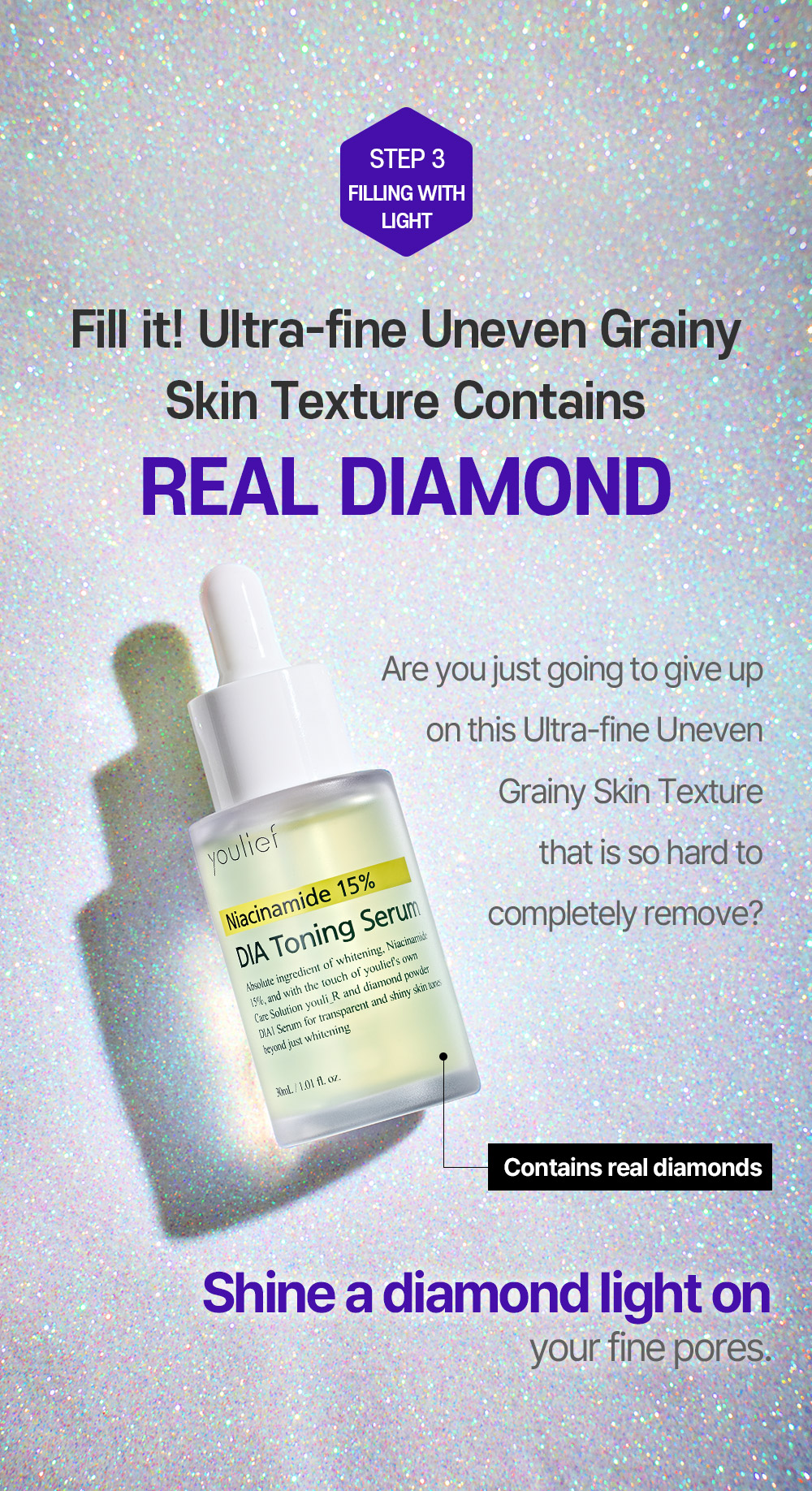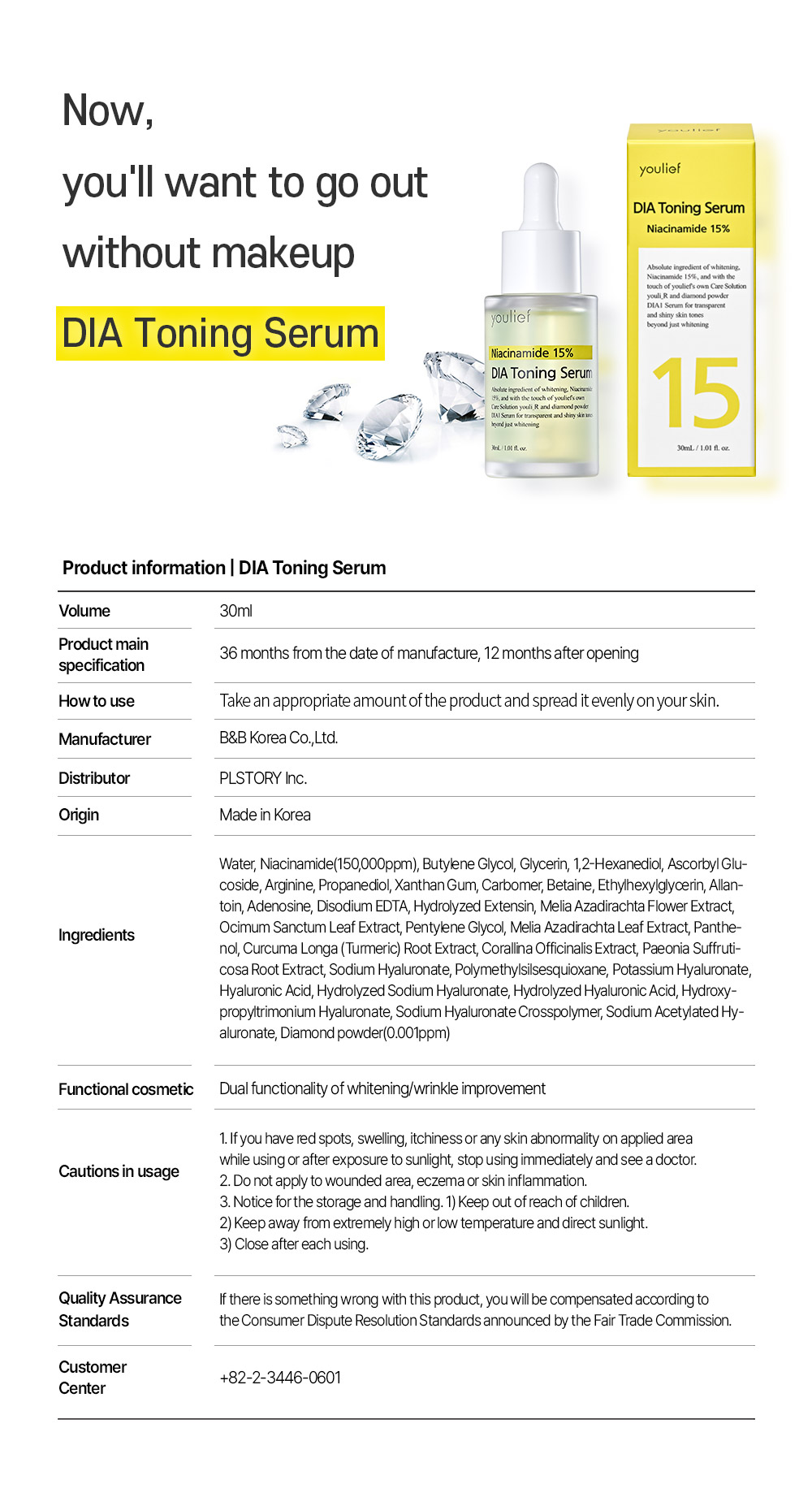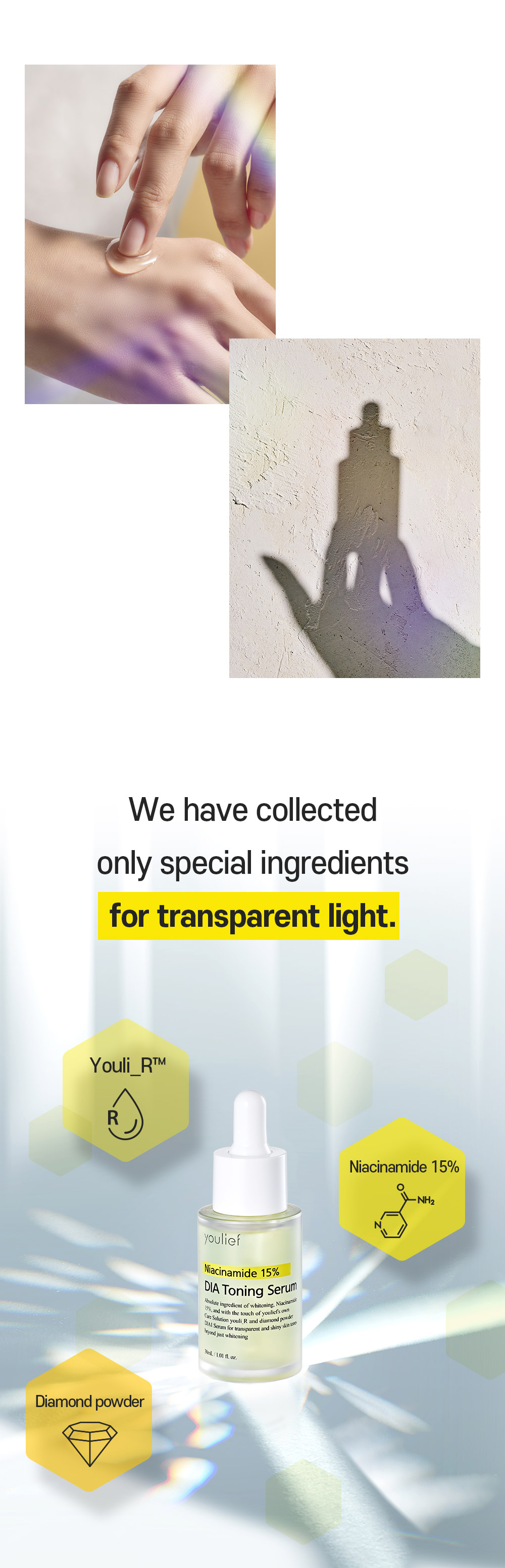Consumer appeal pointsYOULIEF Diamond Toning Serum’s niacinamide suppresses melanin from rising to the epidermis and evens out skin texture, making the entire face brighter. And if vitamin C is used directly on the skin, it can cause great irritation and make the skin sensitive. Ascorbyl glucoside, a secondary ingredient, is a derivative of vitamin C that reduces the skin irritation side effects of vitamin C while maintaining its effectiveness.