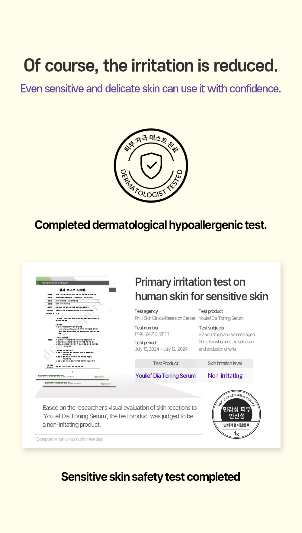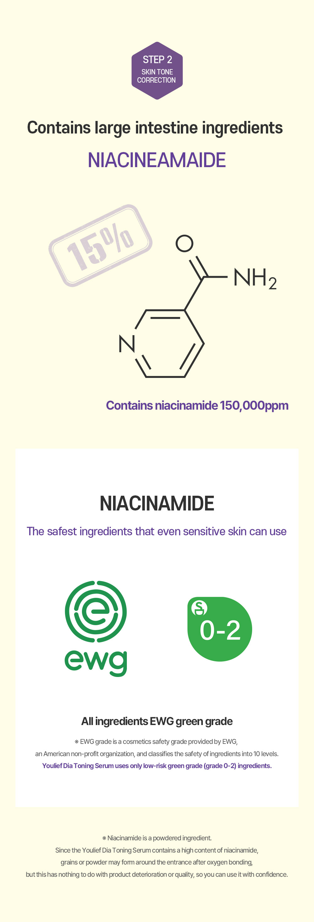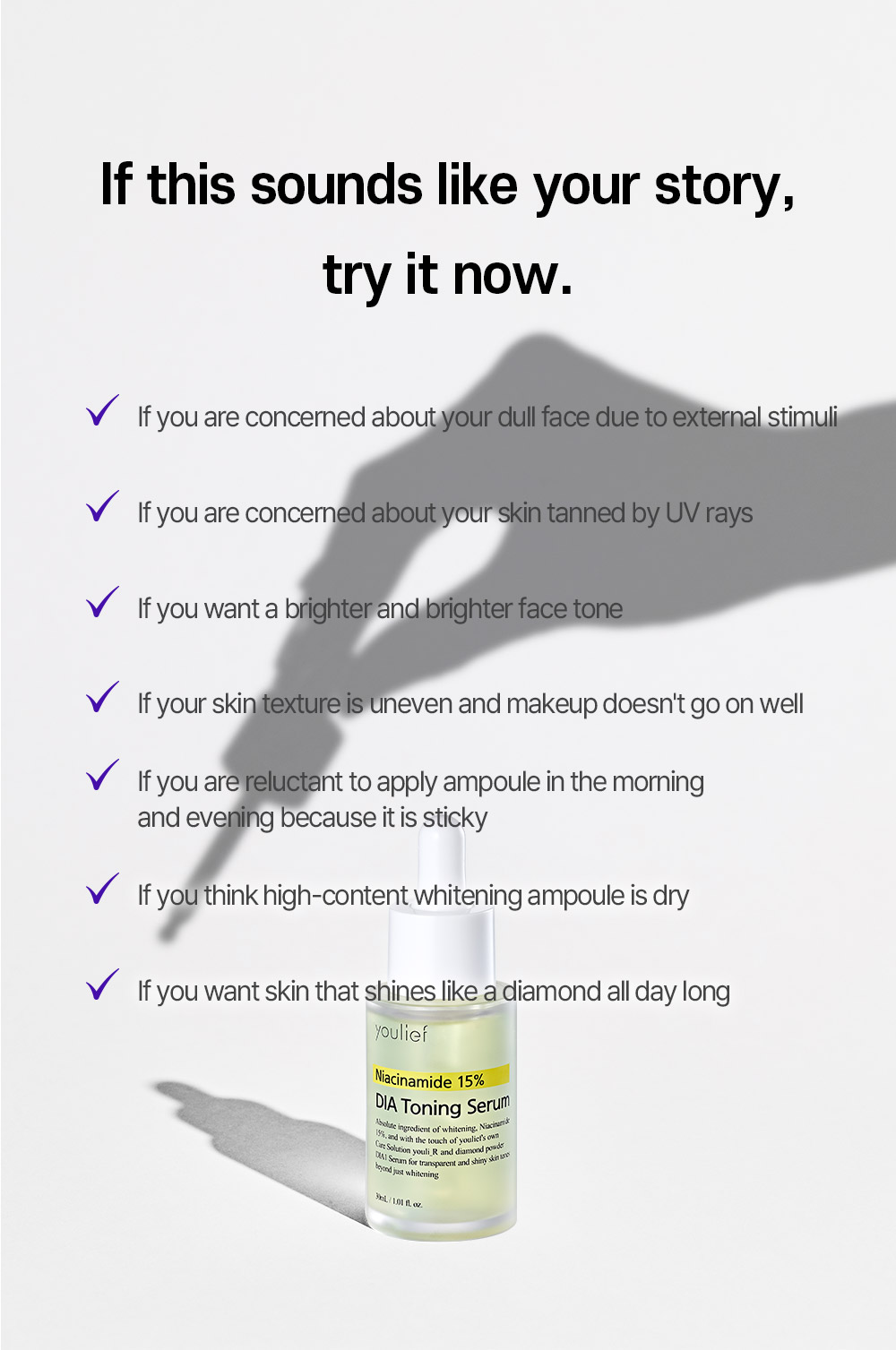 Consumer appeal pointsYOULIEF Diamond Toning Serum’s niacinamide suppresses melanin from rising to the epidermis and evens out skin texture, making the entire face brighter. And if vitamin C is used directly on the skin, it can cause great irritation and make the skin sensitive. Ascorbyl glucoside, a secondary ingredient, is a derivative of vitamin C that reduces the skin irritation side effects of vitamin C while maintaining its effectiveness.